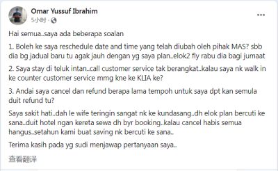 一名住在霹雳州安顺的穆斯林男子奥玛尤索今日在“Mas Airline Info Sharing”脸书公众帐号向网民诉苦,去沙巴昆达山游玩是妻子期待已久的行程,如今一切都被打乱。