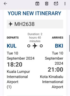另外,一名网民不满他预订9月14日上午8时05分从吉隆坡出发至亚庇的航班被取消,而新的出发日期居然是提前4天!