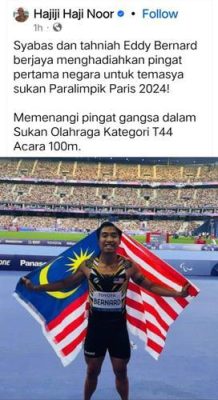 (亚庇2日讯)沙巴短跑选手艾迪贝纳德在2024年巴黎残奥会为大马国家队贡献首枚奖牌,获得沙巴首席部长拿督哈芝芝诺和沙巴青年及体育部长拿督依伦安营先后发文道贺。