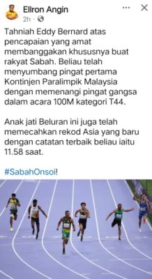 同时,依伦在贴文中表示,这名来自比鲁兰的运动员所取得的成就,让沙巴人民感到引以为傲。