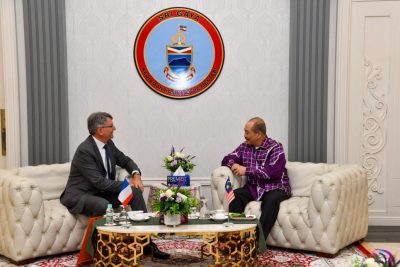 (亚庇5日讯)沙巴首长拿督斯里哈芝芝诺今天在斯里加雅(Sri Gaya)官邸会见法国驻马大使柯瑞宇(Axel Cruau)。会谈中,柯瑞宇大使向哈芝芝诺简报了一艘法国军舰目前停靠在实邦加海域的情况。