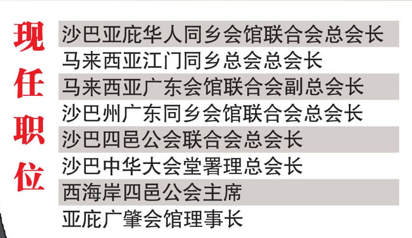 现任沙巴亚庇华人同乡会馆联合会总会长的她同时也是新春龙麒狮大团拜暨文化村的大会主席,是沙巴华人文化的推动者和领军人物。