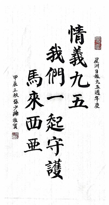 情义九五,我们一起守护马来西亚。张少纶(沙巴亚庇书艺协会主席,马来西亚书艺总会副会长)