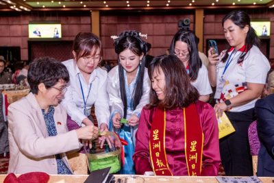适逢中秋节,“嫦娥”和“吴刚”在现场分发月饼给宾客品尝,还有亚庇书艺协会送出限量版“墨舞锦风扇”给参加特别抽奖活动的宾客。