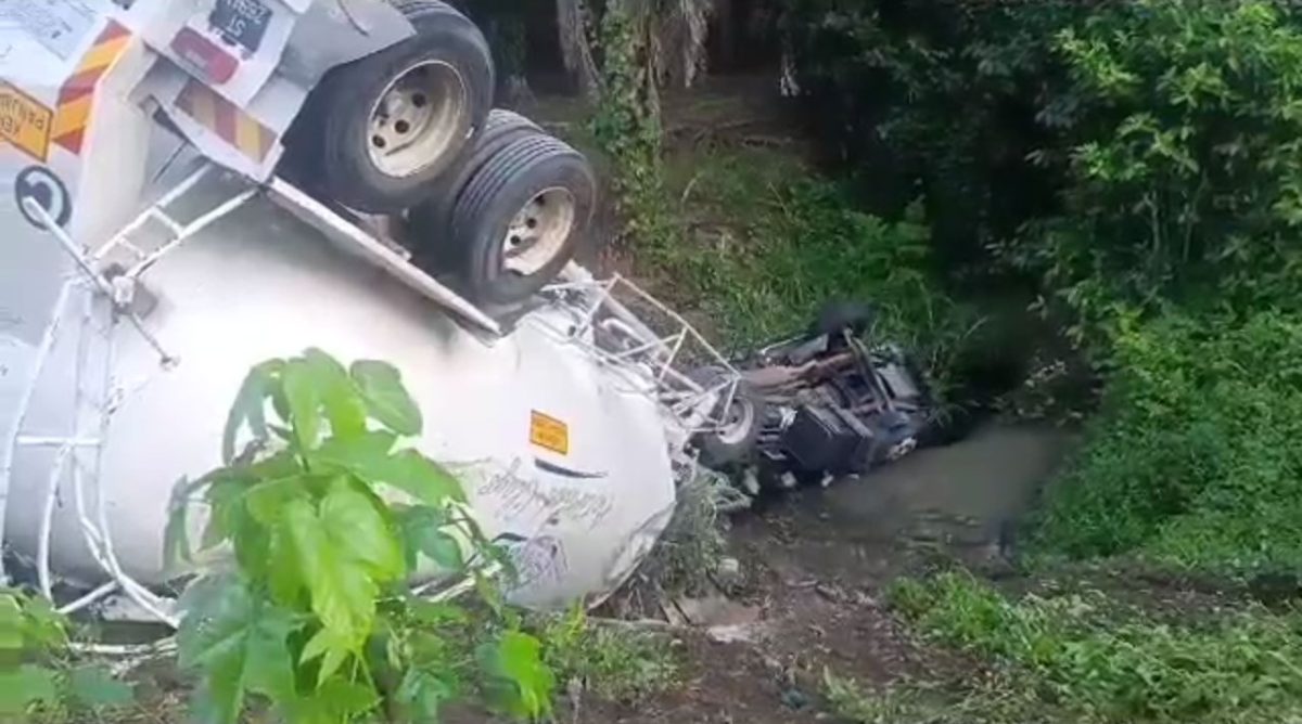 (山打根23日讯)一辆水泥罐车在行驶途中失控,坠落至10米深的山谷中并翻覆,一名相信是司机的男子被困并埋在土中,消拯队正积极展开救援!