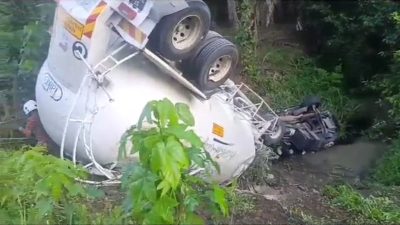 (拿笃23日讯)一辆搅灰车在行驶途中失控,坠落至10米深的山谷中并翻覆,车底朝天,72岁男司机被困并埋在泥土中。消拯队展开近10小时的救援,成功救出司机,但医护人员证实他已重伤身亡。