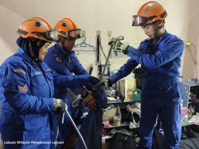 纳闽民防部队昨天下午3时45分接到求助电话后,立即派出救援队前往甘榜班带抓捕蟒蛇。