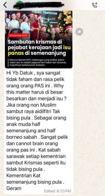 陈泓缣也说,他也收到选民的信息,感叹为何伊党要炒作这件事情:“为何非穆斯林庆祝开斋节时,他们又不吵?沙砂所有部门都欢庆圣诞节,却没有因此成为课题,在半岛就变成了课题,真让人生气。”