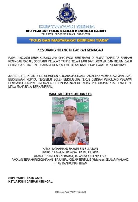 YB250213YLE01.jpg:根地咬一所宗教学校宿舍生莫哈末沙克米苏莱曼失踪。