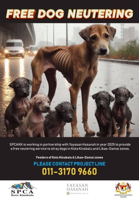 亚庇、里卡士及达迈地区的流浪动物喂食者或居民受促把握难得的机会,踊跃响应此项流浪狗绝育计划。欲了解详情可致电(011-3170 9660)。