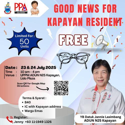 (兵南邦22日讯)为协助有需要的群体减轻生活负担,甘拜园区州议员拿督珍妮拉欣邦办事处将于明天及后天(23日及24日)举办“免费眼镜派发活动”,共准备50副眼镜供合格居民领取。