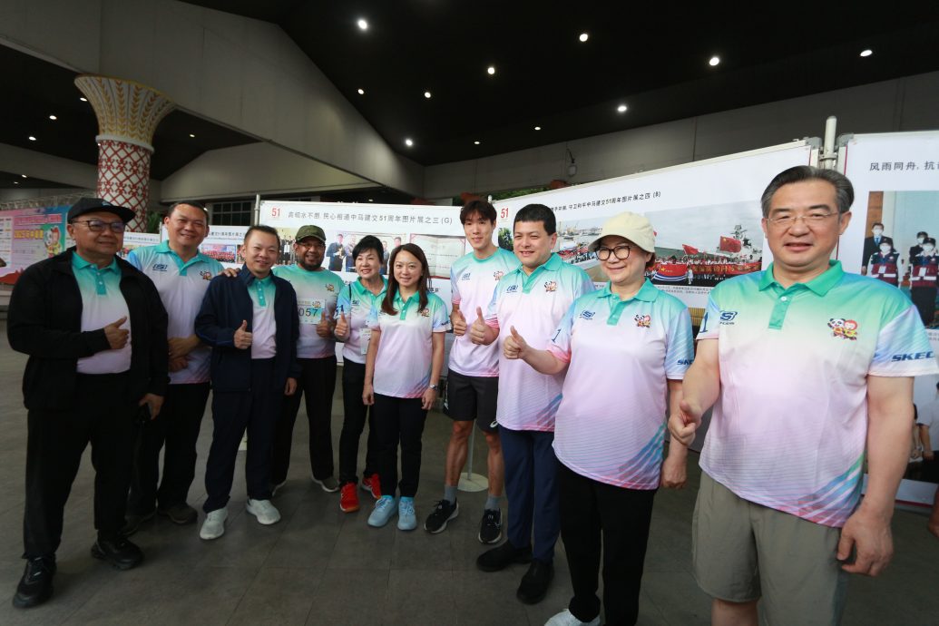 众嘉宾在2025年马中谊跑起跑前合影。前排左起沙巴州议会副议长拿督杨伟光、沙巴财政部助理部长拿督陈历发、联邦种植及原产业副部长陈泓缣、沙巴马中联谊协会名誉会长黄小娟(左五起)、杨巧双、沙巴跳远健将黄嘉驹、沙巴马中联谊协会会长胡逸山、沙巴州旅游、文化及环境部长及中国驻亚庇总领事朱兴龙。