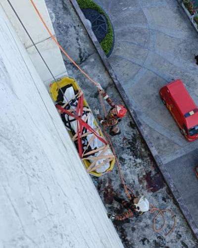 沙巴消拯局行动中心发言人指出,女子从高处坠落后掉在4楼阳台上,难以从商场内部移出,于是消拯员将遗体抬上担架,再利用绳索吊运至地面。
