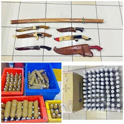 拿笃警区主任祖巴哈林今天发文告证实此案,并指出警方是于周一(28日)突击拿笃诗南路哈拉班园一间住家时,当场起获各类证物,包括:0.41克冰毒、224公升哥冬水、8.2公升咳药水,以及一把武士刀和6把巴冷刀。起获物品总值约为1万1655令吉。