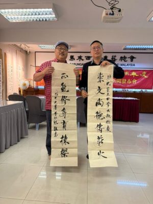 黄幼鲸(左)为“薪火相传・爱吾崇正”书法展挥毫,预祝活动顺利举行。右为沙巴亚庇书艺协会主席张少纶。