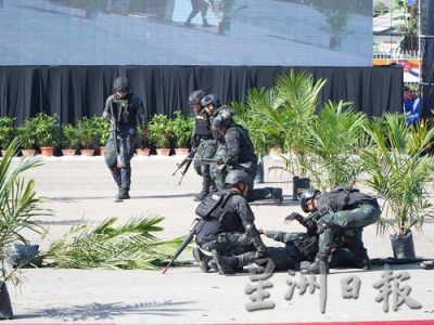 今年州级庆典依然以纪念2013年拿笃甘榜丹道恐怖分子入侵事件为重头战,同时邀请殉职烈士的父母、遗孀与后裔出席,由州元首代表州政府移交抚慰金和诚挚慰问。
