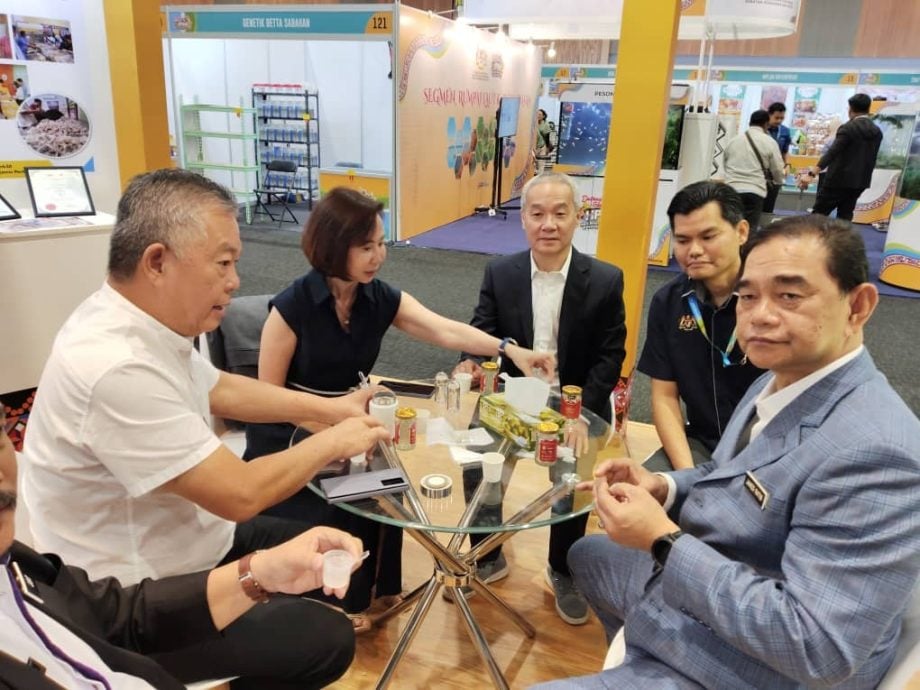 左起谢瑞胜、谢琳燕窝(马)有限公司采购与销售部经理琳达杜、骆义彬、苏玛南及占士拉迪,在2025年全国农民、畜牧业和渔民日庆典的沙巴农民组织摊位上交流及品尝燕窝。