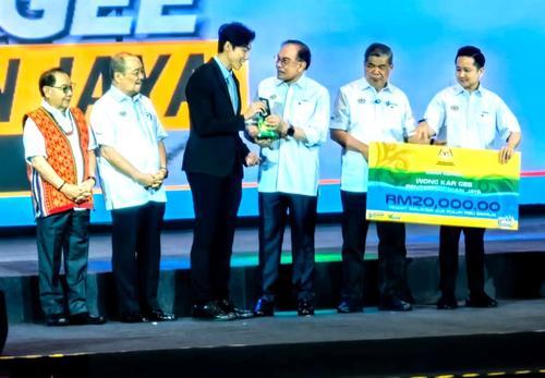 黄嘉驹在沙巴州首席部长拿督哈芝芝诺、农业及粮食安全部长拿督斯里莫哈末沙布与副部长拿督亚瑟古律、沙巴副首长兼农业部长拿督杰菲里吉丁岸等见证下,从安华手中接过奖杯及2万令吉奖金。