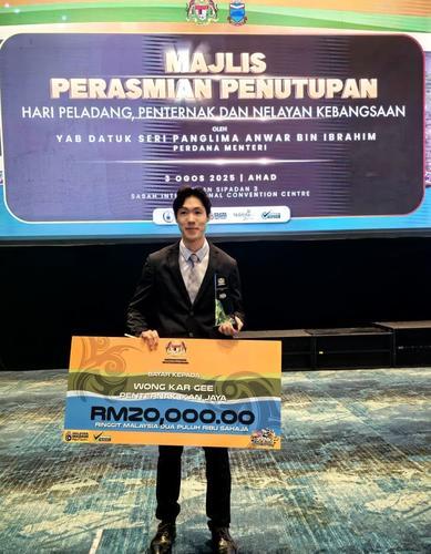 (亚庇3日讯)从区区5000令吉创业资本,短短9年内发展成年收破百万令吉的渔农事业,沙巴著名青年企业家兼运动员黄嘉驹在2025年全国农民、畜牧业者与渔民日庆典荣获“最佳渔业养殖者大奖”,为沙巴州与华人争光。