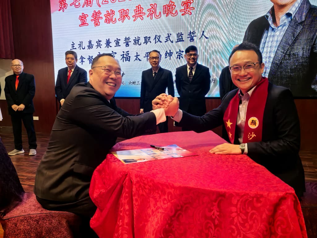 颜家福(右)恭贺颜谆颔出任沙巴颜氏公会会长。
