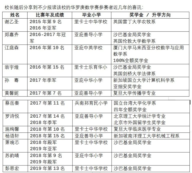 他说,在获得各华小大力支持下,历届在这项数学赛事取得优秀成绩的学生选择加入该校中学课程,随后取得海内外顶尖大学录取专业科系并给予奖学金、沙巴基金局奖学金等。该校采取常态分班,每班人数介于45至50位学生。在全体学生同时报考独中统考及政府SPM考试并且兼顾联课活动发展下,充实的校园生活为中学生打下升上大学的稳固基础,未来能轻松应对大学120至150人的大环境挑战。