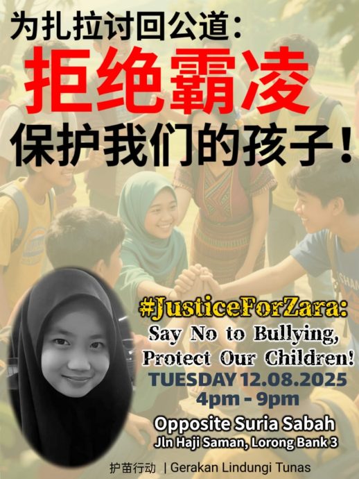 (亚庇11日讯)一项为哀悼查拉凯琳娜及呼吁社会以行动拒绝霸凌的守护儿童免受伤害的“护苗行动”(Gerakan Lindungi Tunas)将于明日(12日)举行烛光集会。