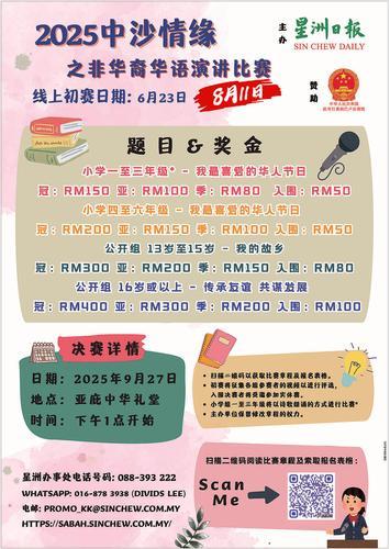 (亚庇21日讯)由沙巴星洲日报主办、中国驻亚庇总领事馆赞助,并获得沙巴教育局批准的“第3届中沙情缘非华裔华语演讲比赛”已于本月11日截止报名。本报共收到145份来自不同源流学校的参赛视频作品,充分体现出沙巴非华裔学生对华语学习的高度热忱!