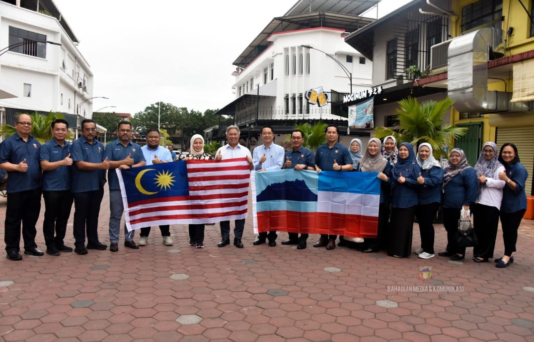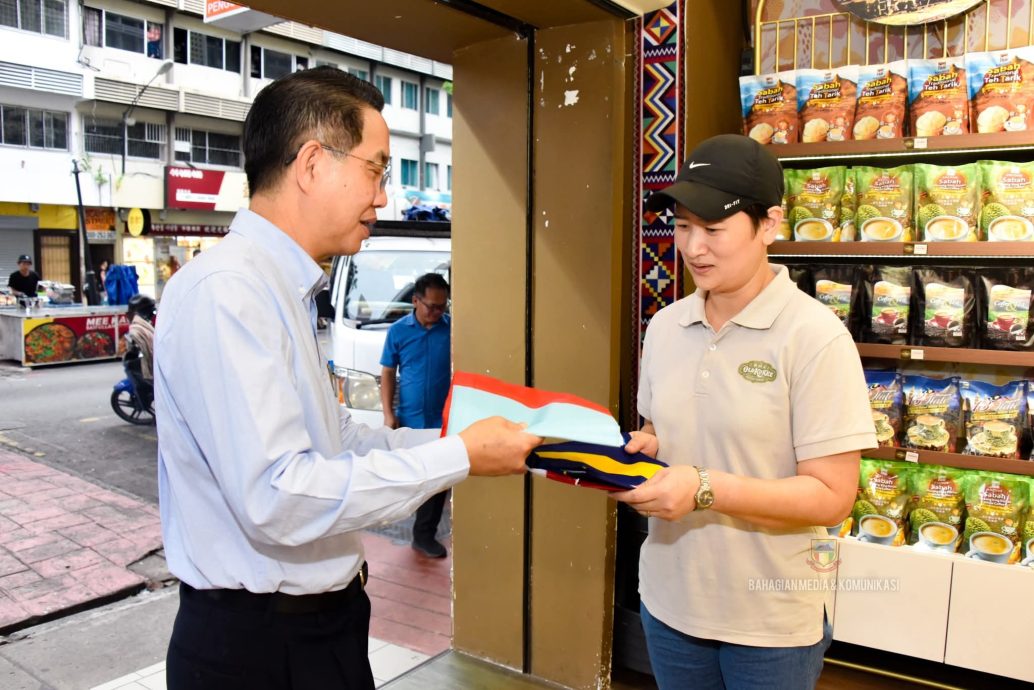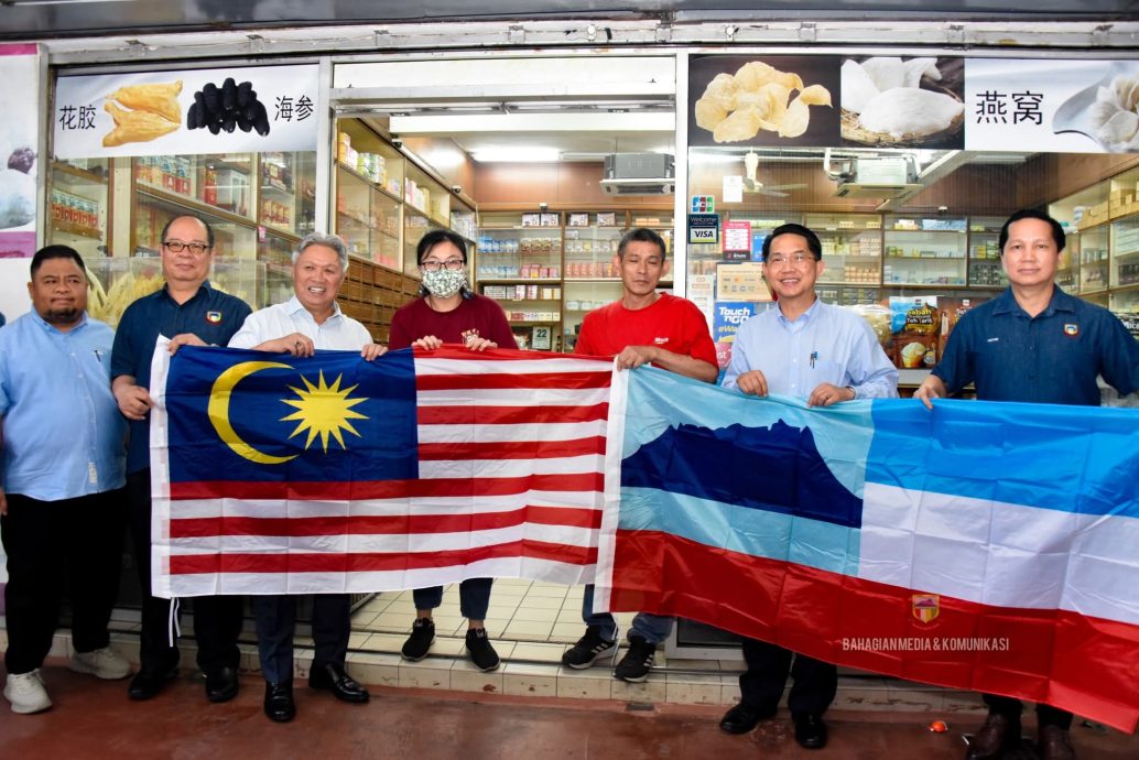 (亚庇23日讯)为了迎接国庆日,亚庇市政厅团队在市长拿督斯里沙宾沙米达的带领下,昨天于加雅街派发国旗和州旗予商家。
