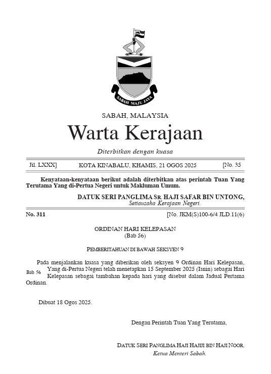 州政府在志期8月21日州政府宪报中,州元首在8月18日依据公共假期条例第9条文赋予的权力,把9月15日列为沙巴额外公假。
