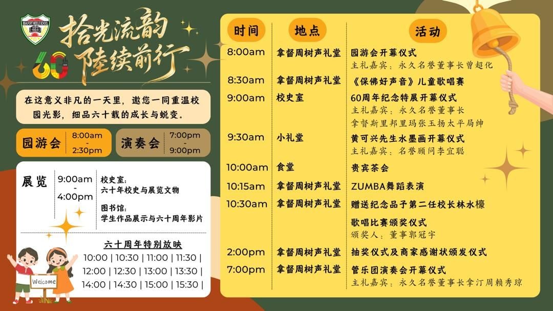 保佛中学于周六(30日)迎来创校60周年纪念,主题为“拾光流韵,陆续前行”,庆典将在校内举行。