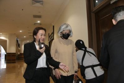邱晶晶(左二)在法庭官员陪同下,准备透过法庭内部特别走道进入验尸庭供证。(图:伍嘉祥)