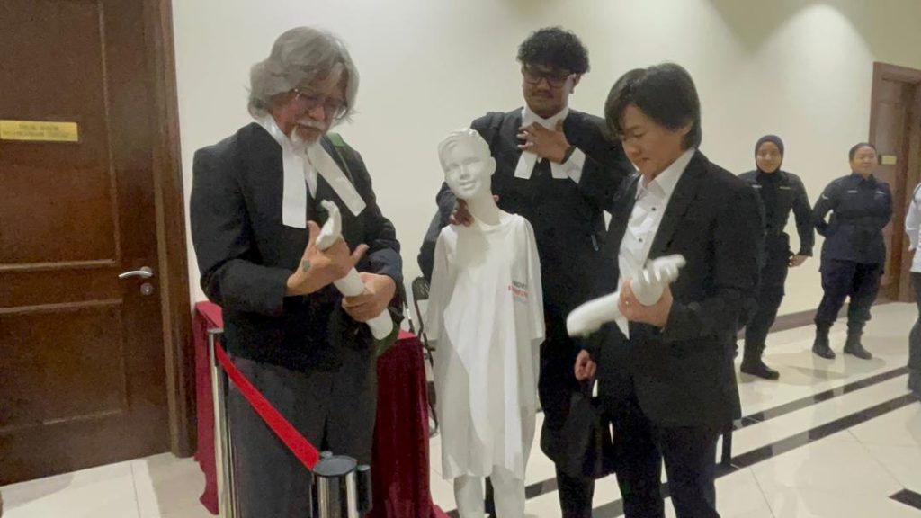 另—方面,被告代表律师直接携带人体模型到法庭,准备让法医讲解查拉的伤势部位。