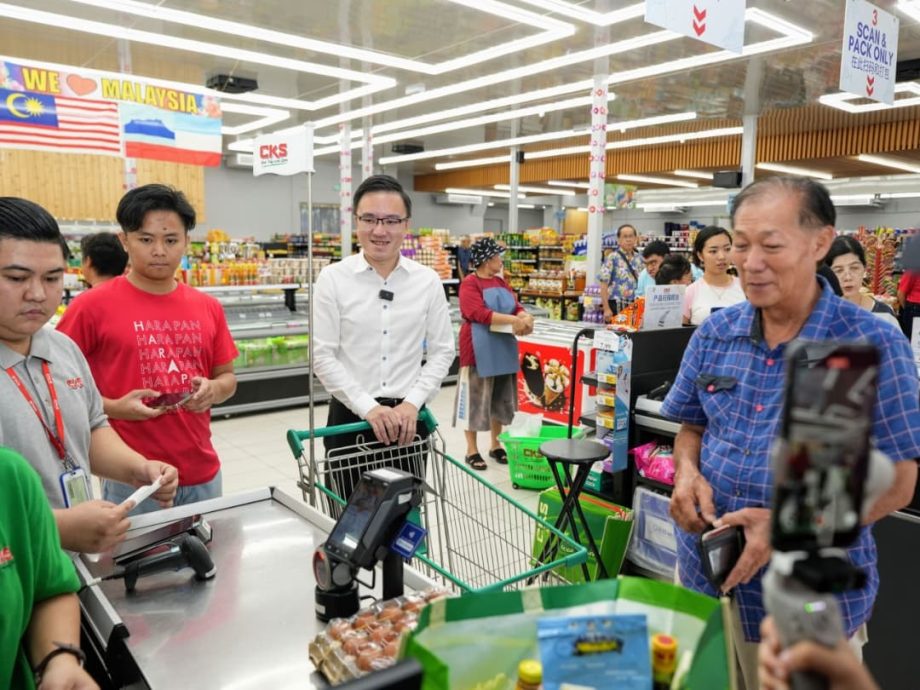 冯晋哲在丽都走访期间也特与路阳火箭团队一同携带乐龄民众前往丽都CKS超市兑换由昌明政府发放的100令吉爱心援助金,与乐龄群体一同逛超市。