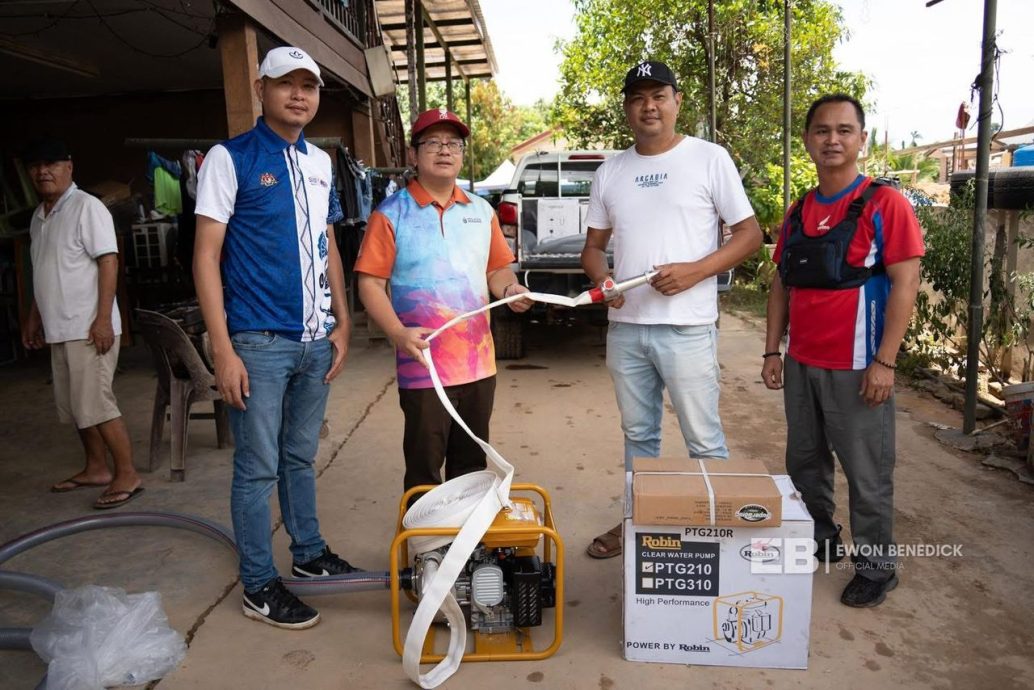 他也移交抽水机予甘榜东卡航、甘榜Proper及甘榜杜亚汶的乡村发展及治安委员会,让受灾居民可轮流使用,以清理住家淤泥。