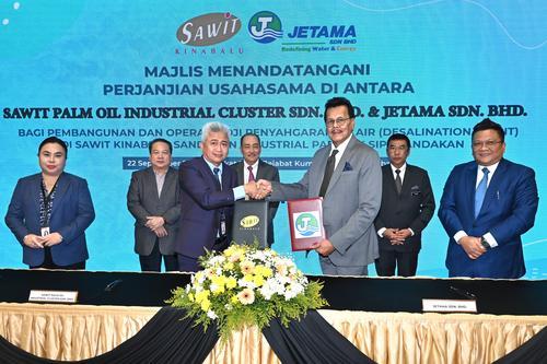 (亚庇22日讯)沙巴州政府官联公司Sawit Kinabalu集团子公司Sawit棕油工业综合有限公司(SPOIC)今日与JETAMA有限公司签署合资合作协议,在山打根的Sawit Kinabalu山打根工业园(SK KIP)开发一座每天产量达200万公升的海水淡化厂。