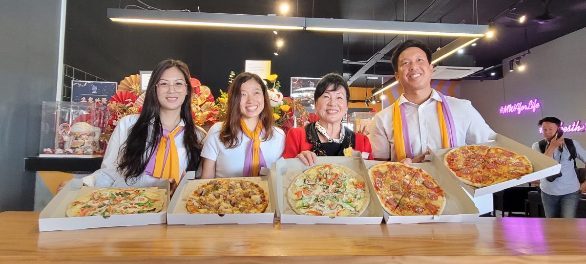 黄小娟(右二)、黄家韵(左二)等展示MWA SHAKES各种口味的披萨。