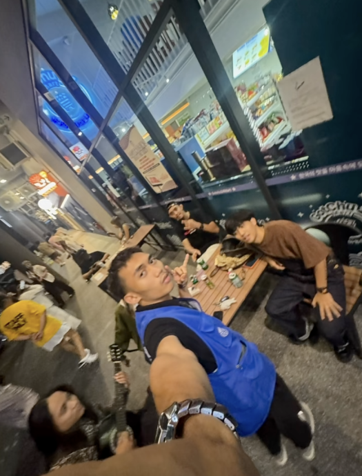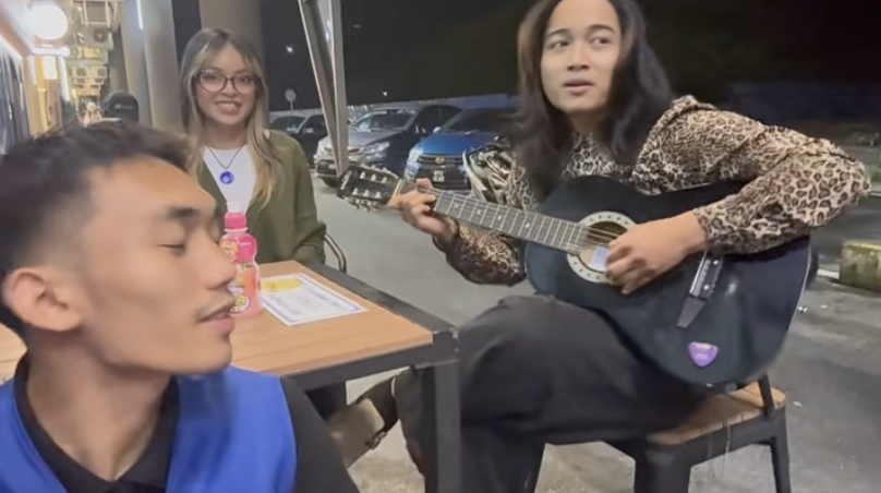 视频中,一群年轻人坐在便利店外,一边喝酒、一边弹吉他聊天,气氛愉快。