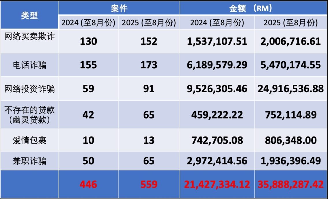 “其中,网络投资诈骗金额最大,今年至8月为止,已经多达2491万6536令吉88仙。”