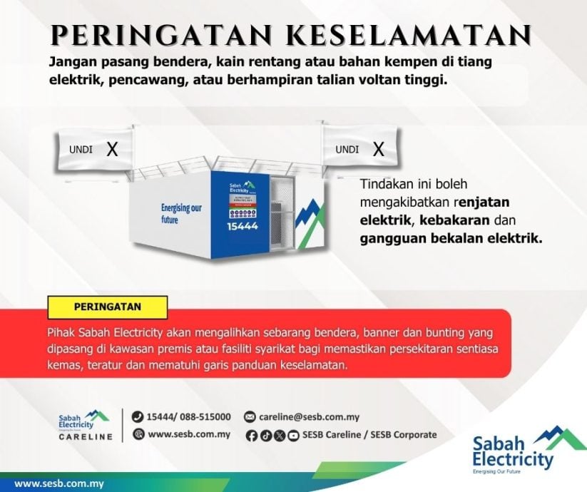 (亚庇23日讯)沙巴电力公司(SE)呼吁民众,在沙巴州选举期间切勿在任何电力设备上悬挂旗帜、横幅或布条,以免引发意外。