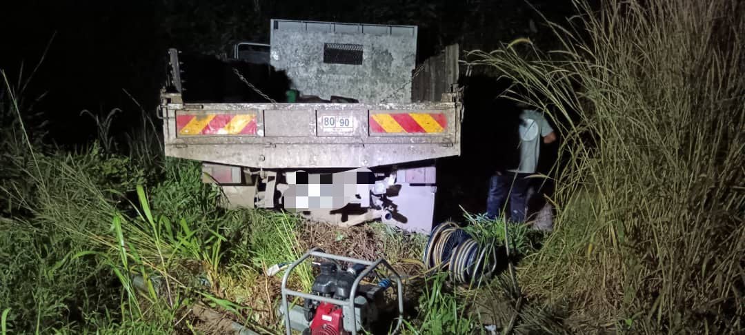 罗里失控冲入草丛,司机受困车内。(沙巴消拯局供图)