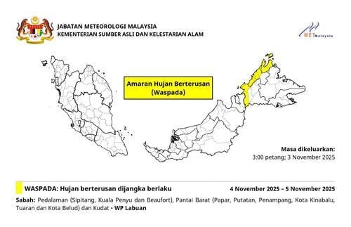 据指出,沙巴与纳闽在此期间或将出现持续雷雨、强降雨及大风天气。气象局已对沙巴及纳闽海域、南中国海及苏禄海发出强风与巨浪警报,警告自11月4日至7日生效。