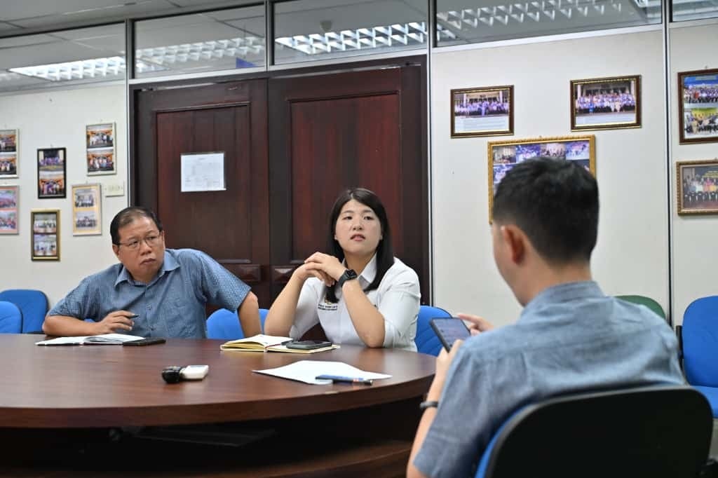 董思筠(中)向山打根水务局工程师了解山打根未来几天的断水状况。