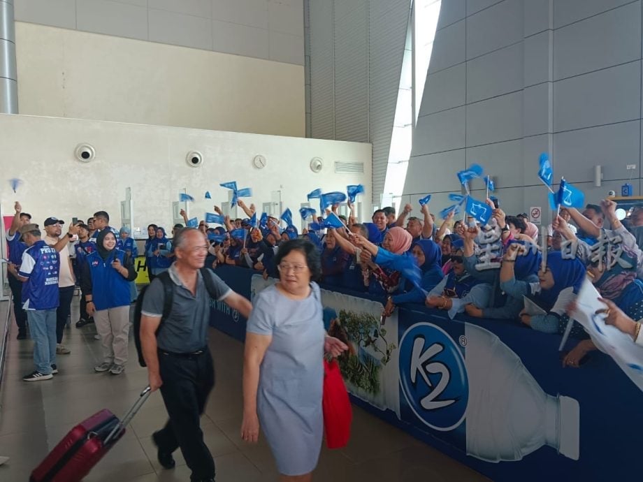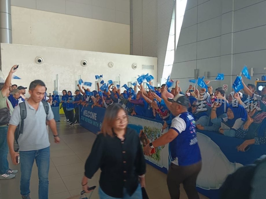 《星洲日报》记者今天下午1时许抵达山打根机场,听见出境处欢呼声不断,然后在出境处看见无数的国阵支持者举起国阵旗帜,摇旗呐喊,犹如进入竞选期,场面热闹。
