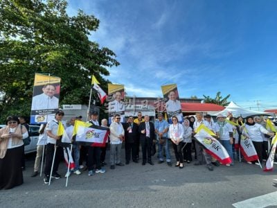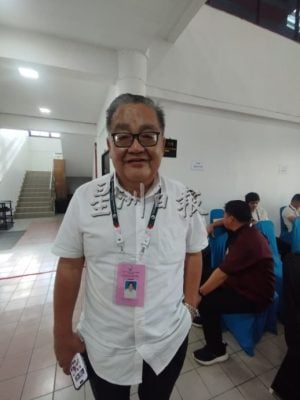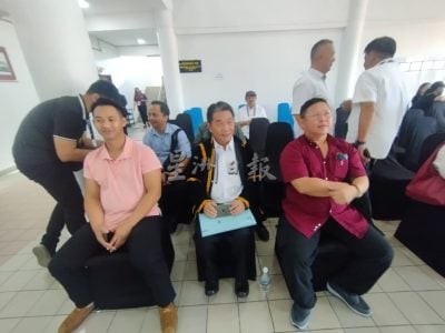 肯雅兰全民党的丹绒亚路区候选人骆意荣,以及丹绒哥拉末区候选人嘉斯尼末拉尼 ,与支持者一早在斯里必打丹礼堂外等候。