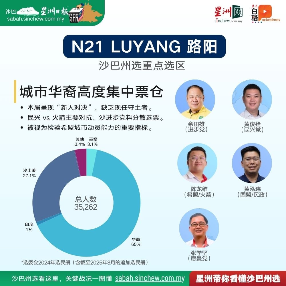 路阳一直是沙巴最经典的城市华裔选区之一,今年却出现了久违的“无现任守土者”的新人对决。民兴党的黄俊铨与行动党的陈龙维正面交锋,沙进步党的余田雄则可能分走部分票源。