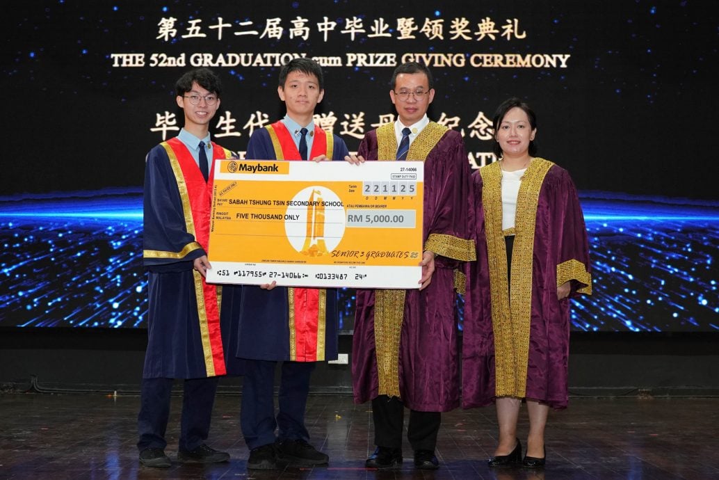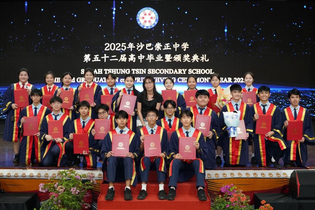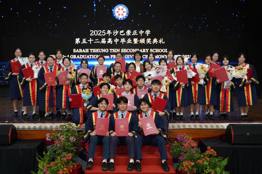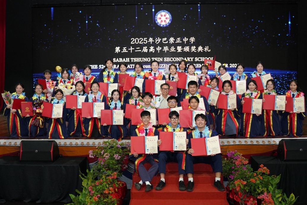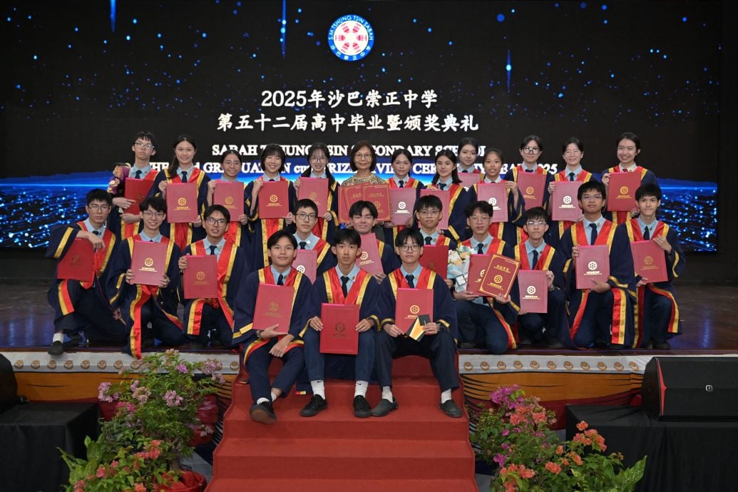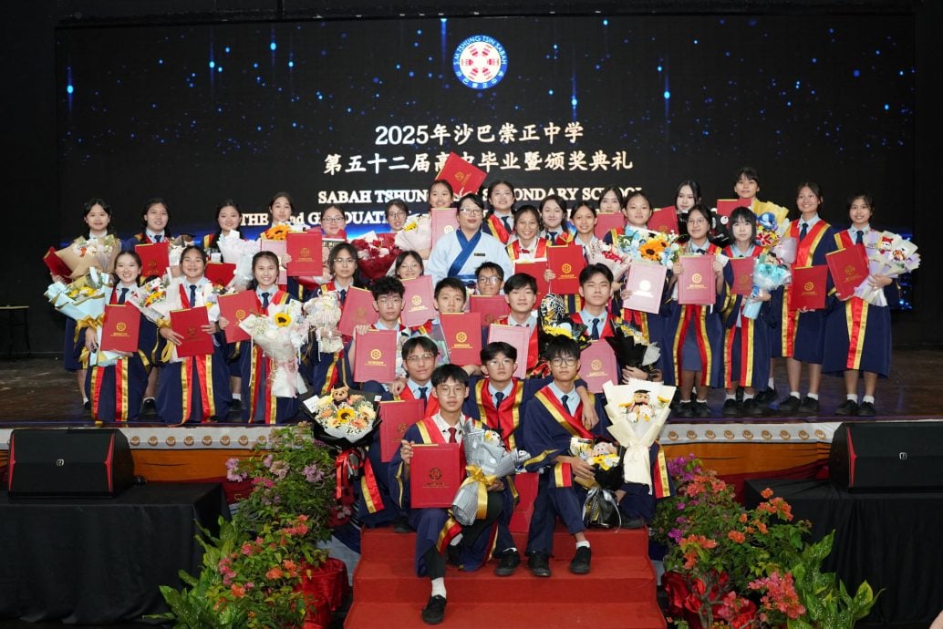 (亚庇22日讯)沙巴崇正中学举办第52届高中毕业暨颁奖典礼,由该校董事长兼亚庇客家公会主席拿督杨菊明担任主宾,为146名高三毕业生颁发证书。