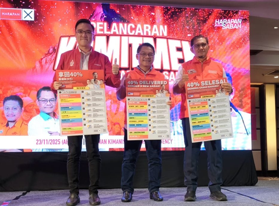右起:慕斯达法沙末(公正党)、冯晋哲(行动党)、拉希鲁(诚信党)展示沙巴希盟竞选宣言看板。