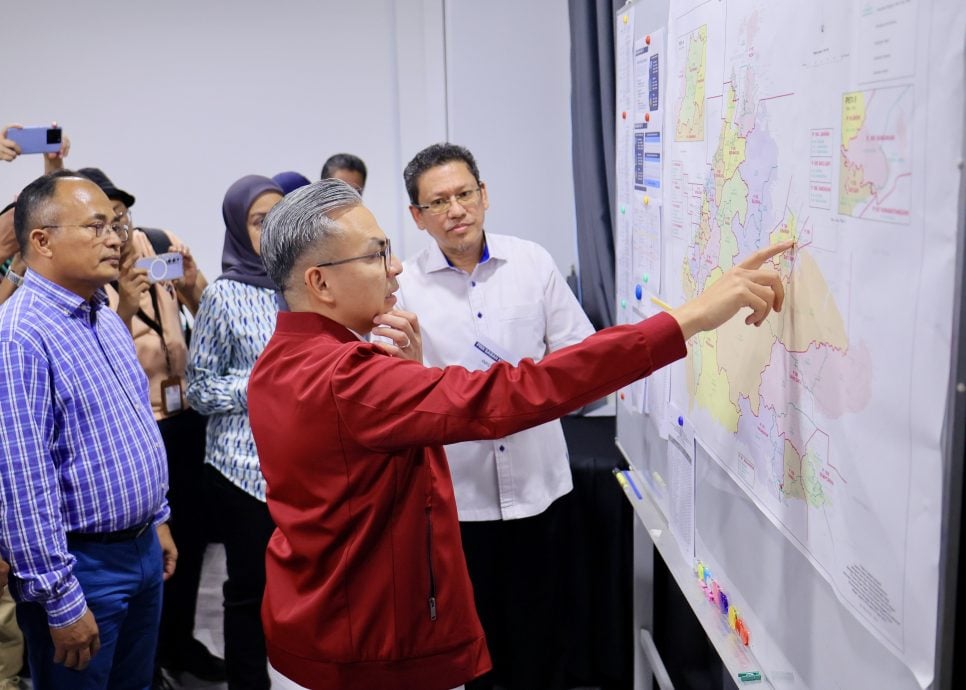 法米(前者)巡视位于兵南邦的新闻局沙巴选举媒体中心。(马新社图)