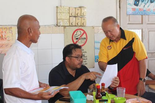 骆意荣(右)认真拜票,向每个人介绍其竞选承诺。