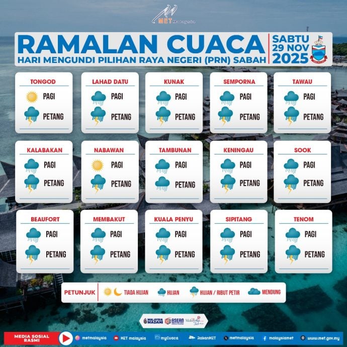 气象局和沙巴州国家安全理事会提醒民众,尤其是选民,应提前规划行程,驾驶时提高警惕,并注意路滑、闪电水灾及雷暴等可能情况。
